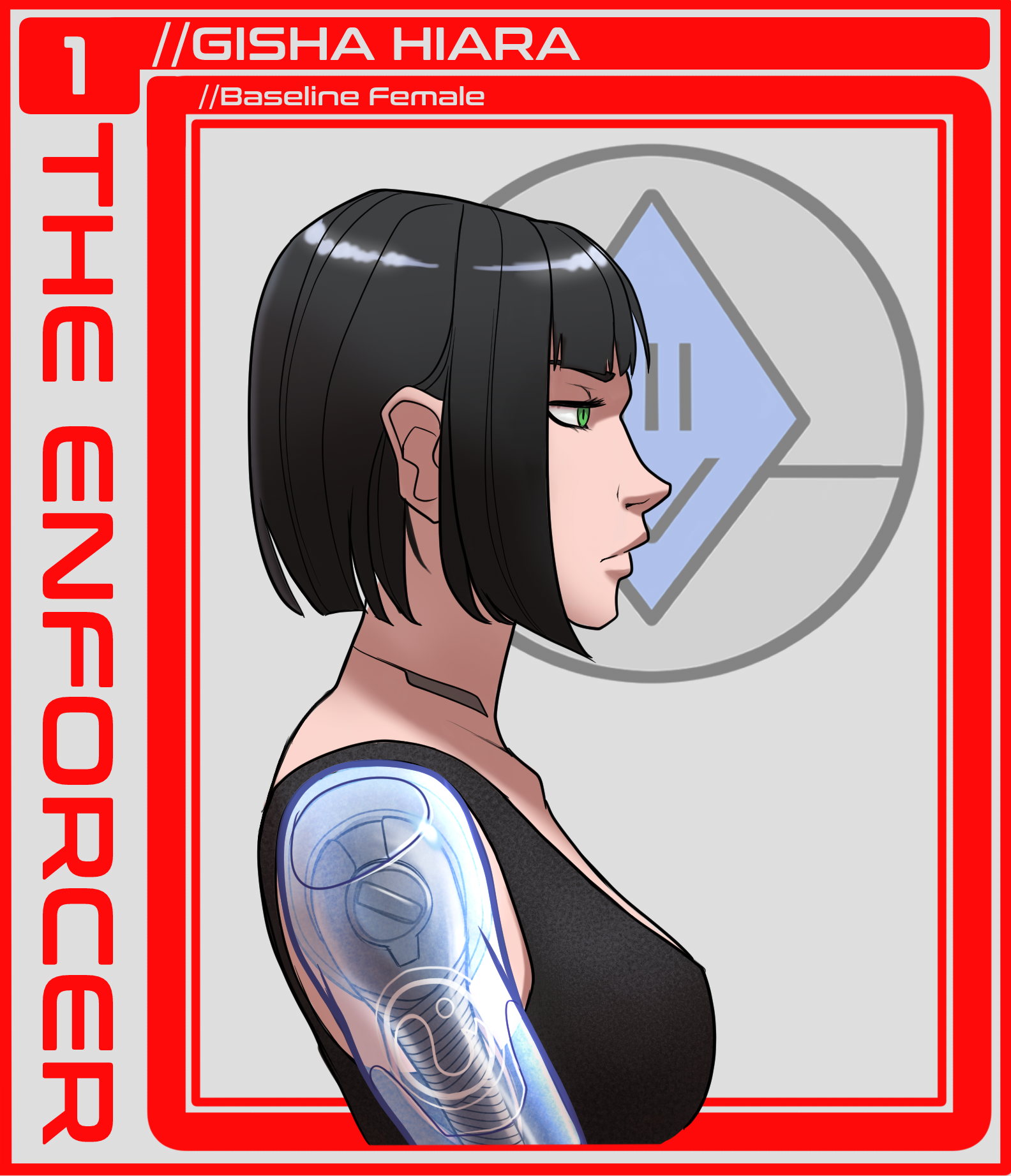Ganymedian born, Gisha served as a shock trooper in the Unity of Ganymede’s Emerald Legion during the Prestid Rebellion. She lost her right arm in the operation and she suffers chronic withdraw symptoms from the combat drug Gladiator. Jaded by the Unity, she now lives in Vesta, working for the Space Security Guild as a flight-rated enforcer.
