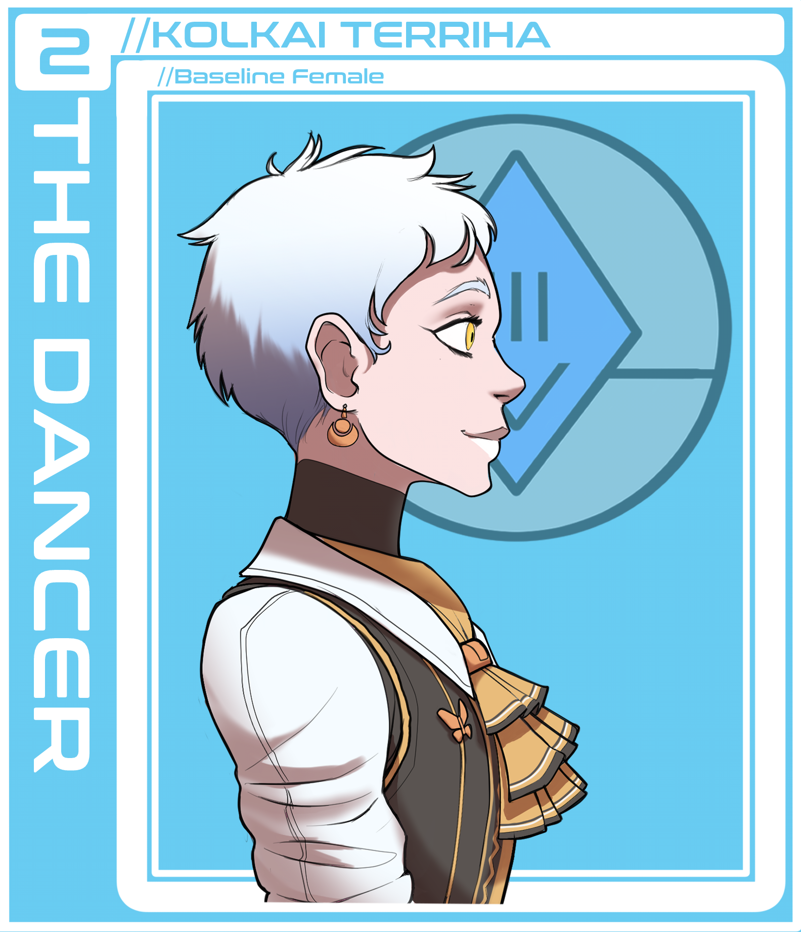 A skilled dancer, Kolkai’s true public premier was at the 2364 Inter System Olympics where she swept the floor dance and free dance competitions. Today, she’s a renowned somnoptic performer, attracting millions both live and remotely with her ice-themed performances. She lives on Vesta, running her own brand and occasionally working for the Vestan tourism commission.