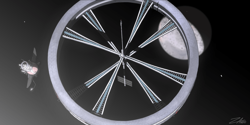 These first habitats were built at great expense, often piece by piece from construction materials launched from Earth. In the early twenty first century, space manufacturing capacity increased greatly and the continental nations began testing the limits of orbital construction. Habitats became more ambitious in scale and engineering, many built with the prospect of long term dwelling. The first permanent habitats were completed on Luna in 2034. Atlantis, the first large scale spin station, was completed in Earth orbit in 2080, nearly forty years after the first asteroids were delivered into Earth sphere for deconstruction.