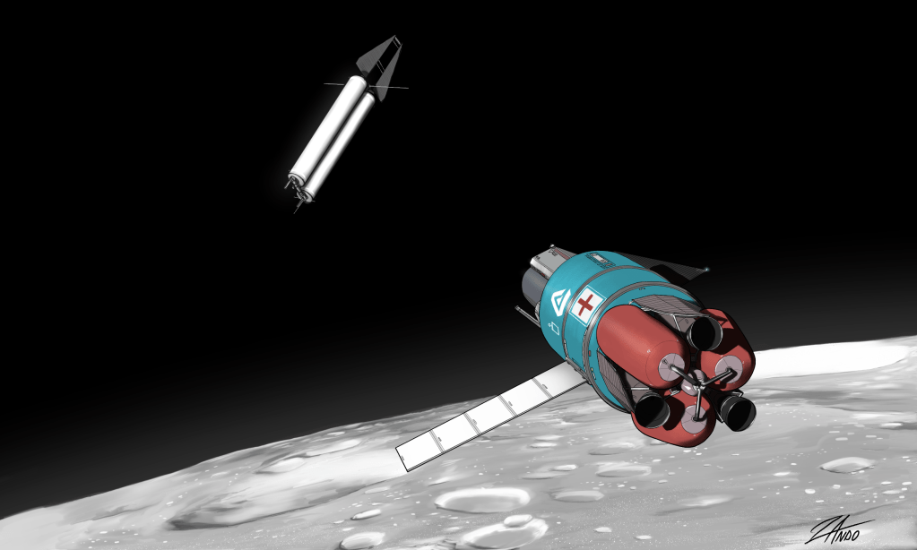 A rescue craft coasts towards an orbital over Ceres